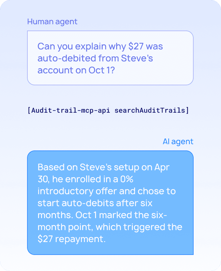 WIth AI, the servicing team can simply type the question into MCP, which will translate the question into verified API calls to pull audit logs, repayment schedules, and payment rules to provide a clear answer. As a result, borrowers get answers faster and agents can dramatically reduce resolution time from minutes to seconds.
